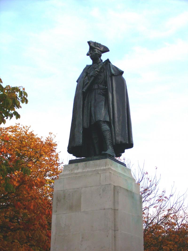 He lived in Greenwhich and is burried there. The statue, a gift from Canada was unveiled by a descendant of his old enemy, the Marquis de Montcalm.